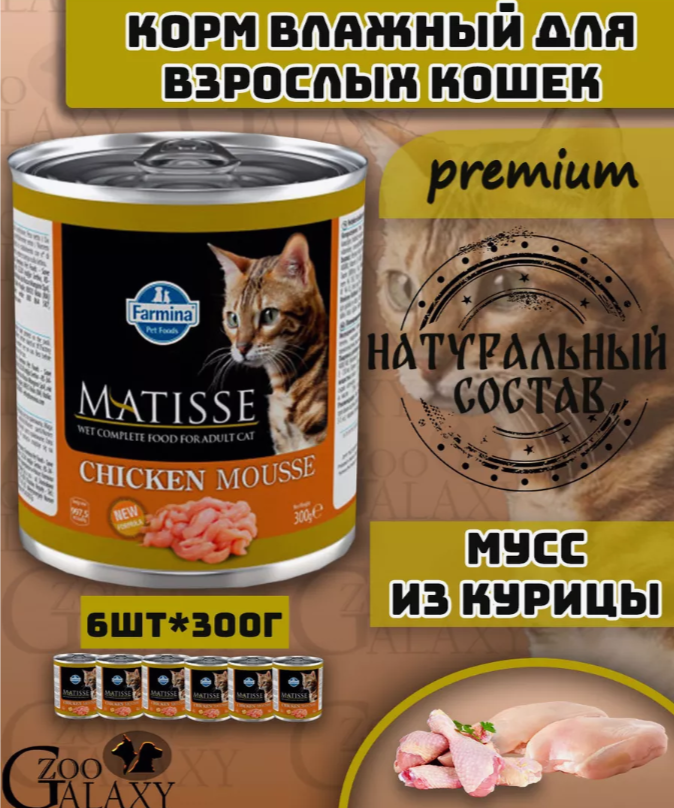 Влажный корм для кошек Matisse Chicken Mousse,курица,упаковка 6 шт х 300 гр