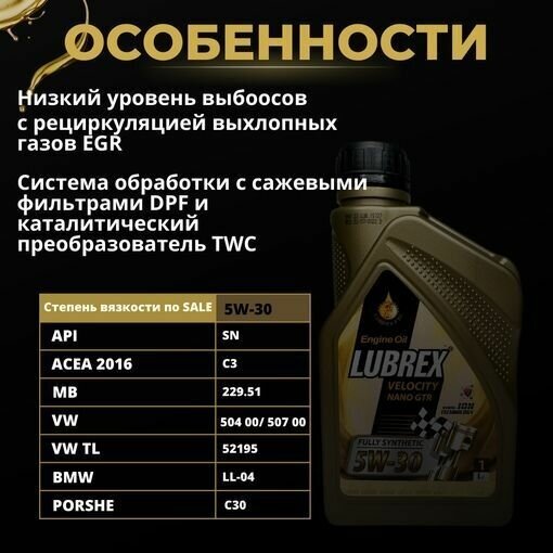 Масло моторное 5w30 син. VELOCITY NANO GTR LUBREX (SN/CF/C3) 4л интересное: