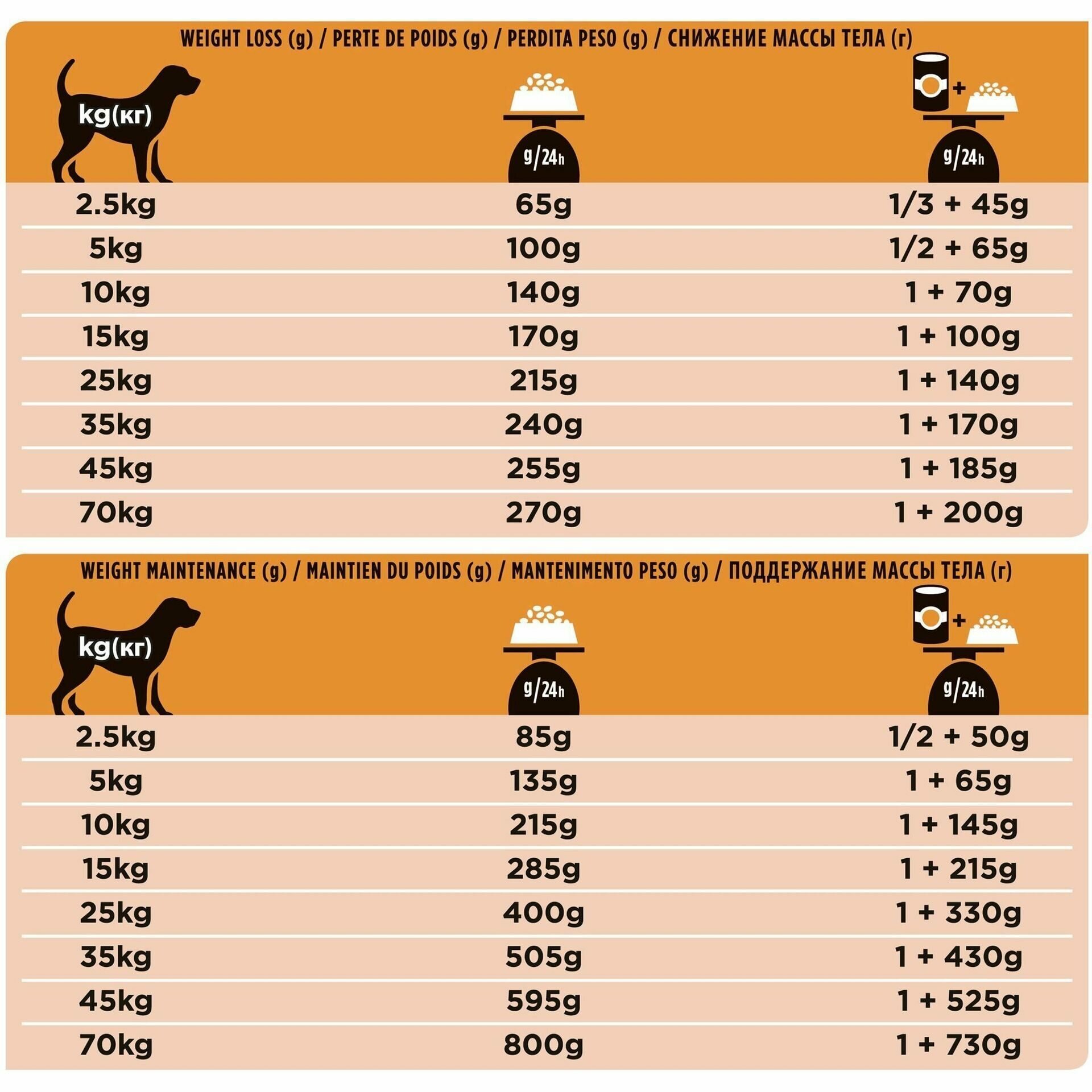 | Дополнительная информация | рекомендуемая суточная норма для снижения веса определяется фактическим весом собаки и желаемым темпом его снижения - 2% от массы тела в неделю; каждые 4 недели нужно корректировать суточную норму в зависимости от фактического веса собаки; кроме того, величина суточной порции может быть изменена в соответствии с индивидуальными потребностями животного |