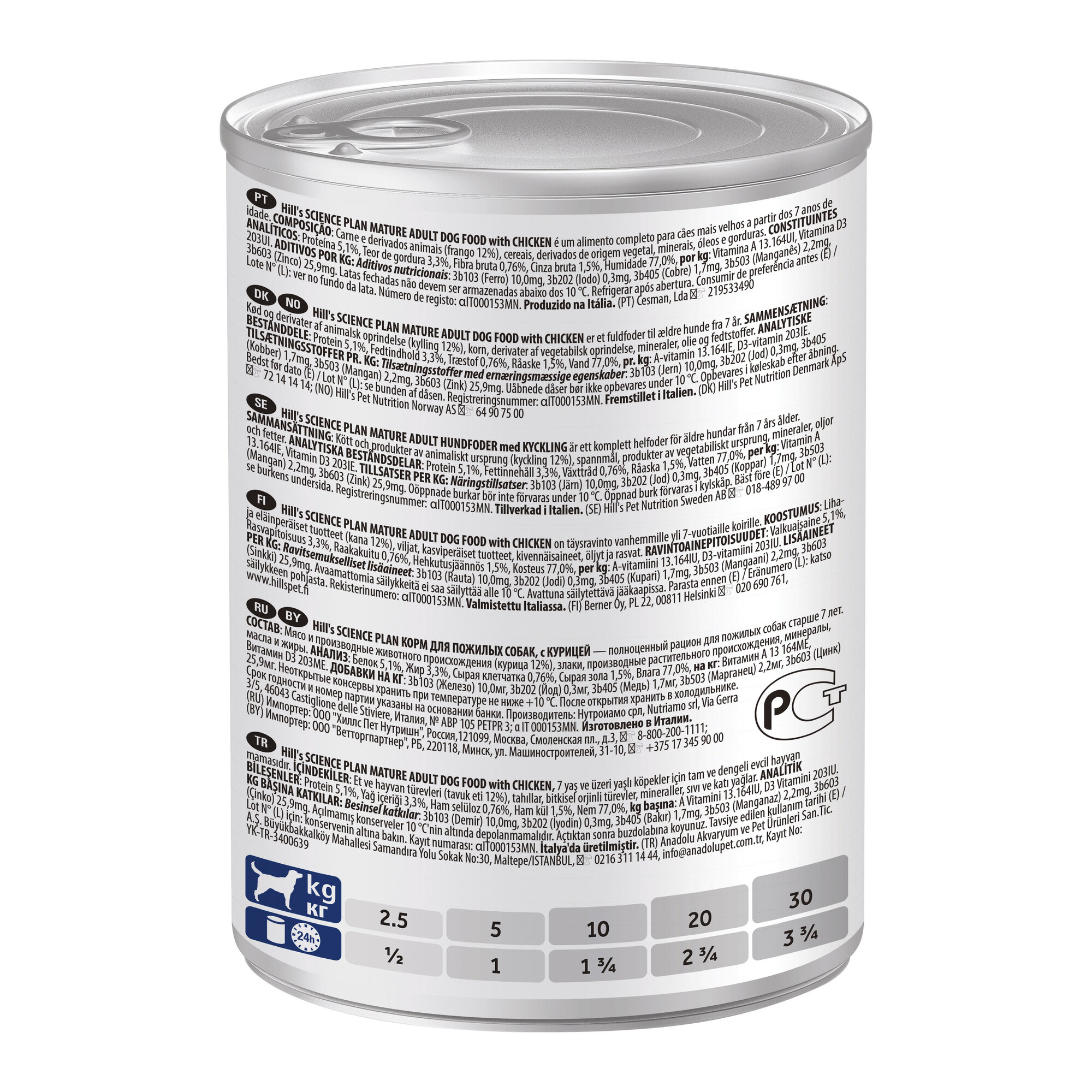 | Дозировка | Следуйте рекомендациям по кормлению, указанным на упаковке. Скорректируйте количество корма в соответствии с размером вашего питомца для поддержания оптимального веса. Если у вас есть сомнения, обратитесь к ветеринарному специалисту. Пробуете этот корм впервые? В течение 7 дней постепенно увеличивайте содержание нового корма по отношению к прежнему до момента его полного замещения. У собаки всегда должен быть доступ к чистой питьевой воде! Потребности ваших питомцев в питании могут меняться с возрастом. Уточняйте у вашего ветеринарного специалиста подходит ли текущий рацион вашему питомцу на каждом осмотре. |