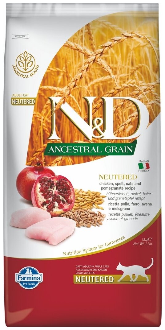Сухой корм Farmina N&D Ancestral Grain Chicken & Pomegranate Adult Neutered, для взрослых стерилизованных/кастрированных кошек/котов, низкозерновой, курица и гранат, 5кг