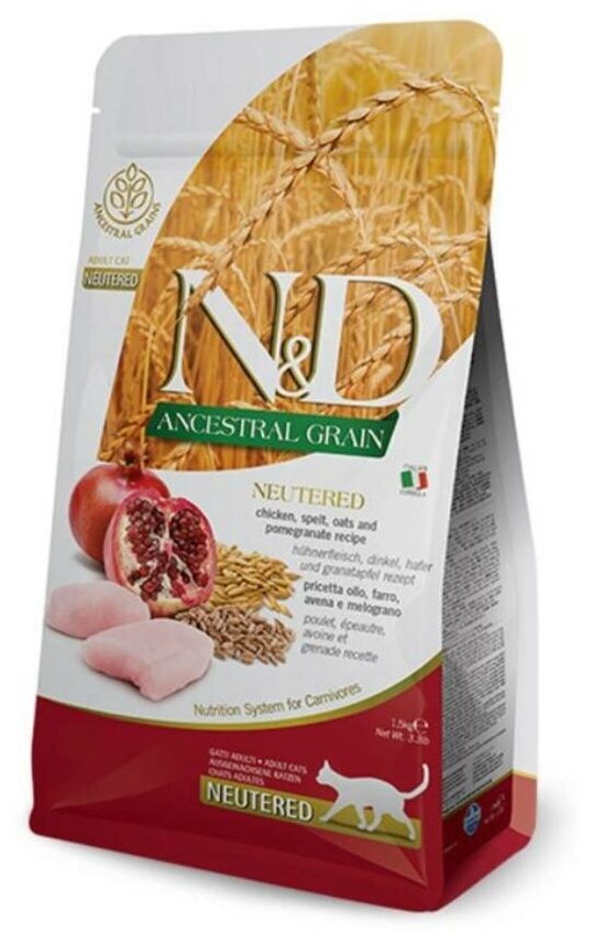 FARMINA CAT N&D ANCESTRAL GRAIN NEUTERED CHICKEN & POMEGRANATE низкозерновой для взрослых кастрированных котов и стерилизованных кошек с курицей и гранатом (1,5 кг)