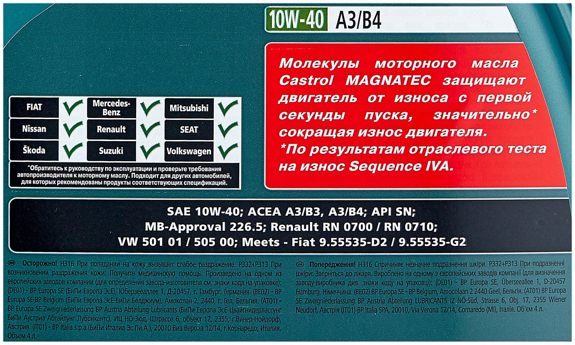 Castrol Масло Моторное Magnatec А3/B4 10W-40 Полусинтетическое 4 Л