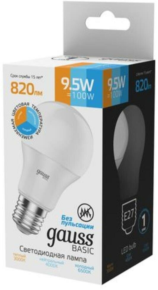 Лампа Gauss BASIC A60 9,5W E27 820lm 3000K-4000K-6500K 1/10/50 1023240 интересное: