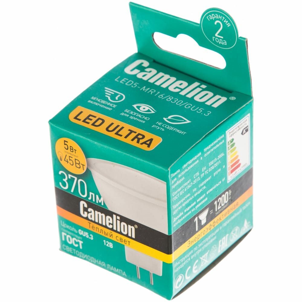 Лампа светодиодная 5Вт 3000К тепл. бел. GU5.3 370лм 12В Camelion CAMELION LED5-MR16/830/GU5.3 (1 шт.)