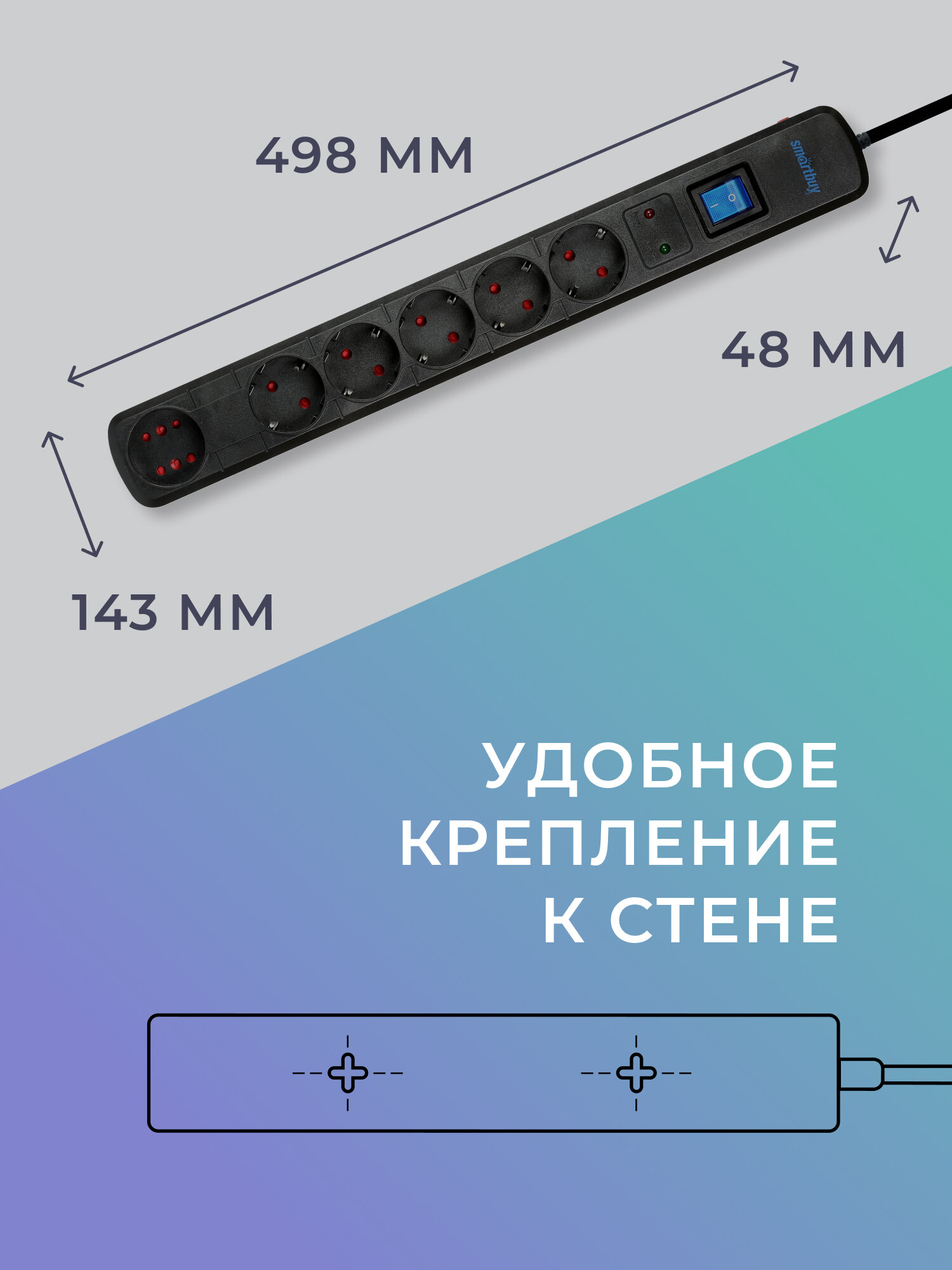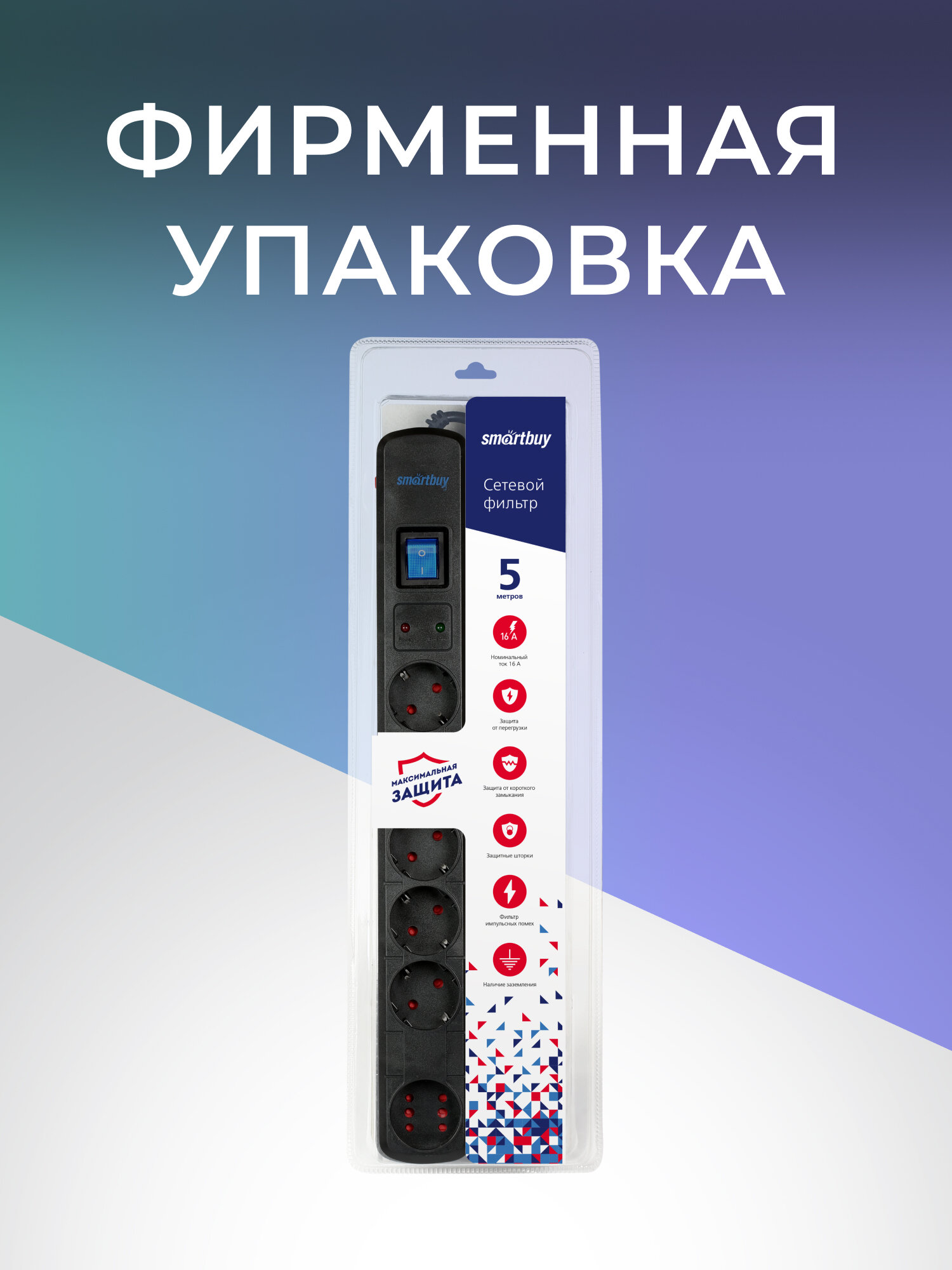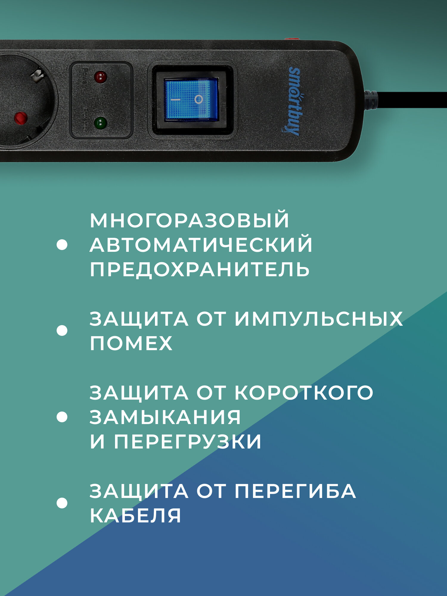 Удлинитель с функцией сетевого фильтра 16А, 3500 Вт, 6 гнезд, длина 5,0 м, черный, Smartbuy интересное: