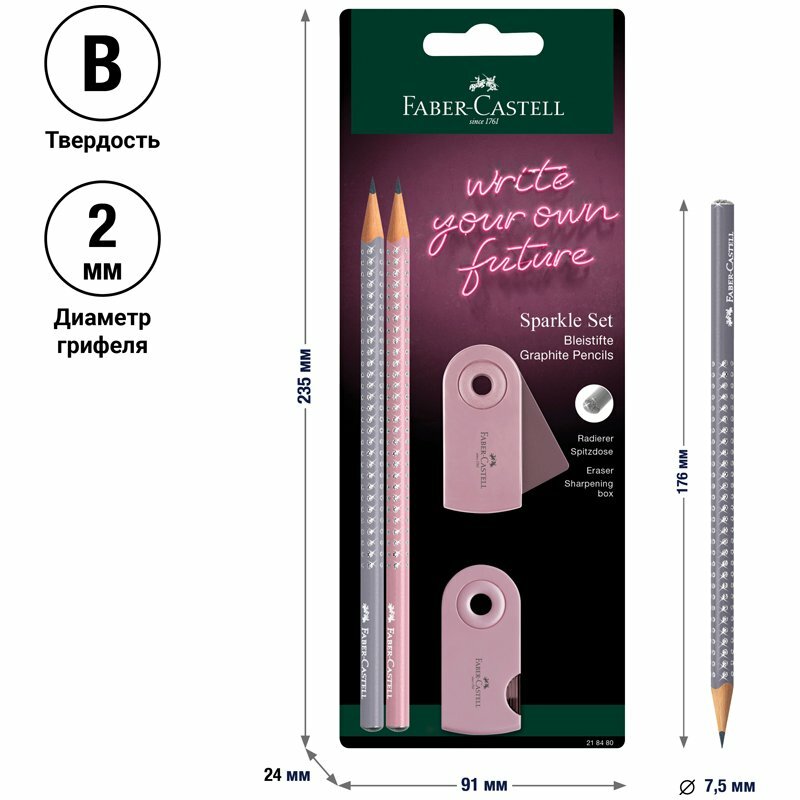 Набор карандашей чернографитных Faber Castell Sparkle, 2 штуки, трехгранные, заточенные + точилка и ластик Sleeve Mini