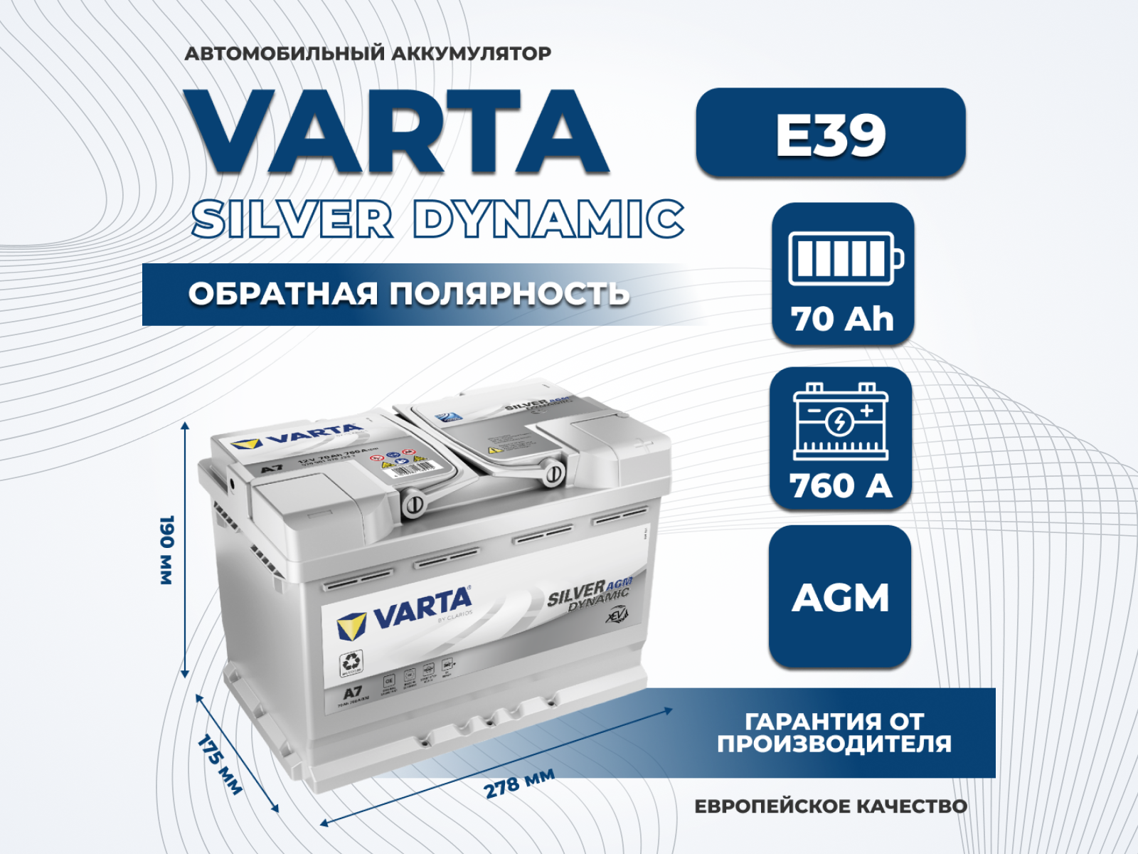 Аккумулятор автомобильный Varta Silver Dynamic AGM E39 A7 70 А/ч 760 A обр. пол. Евро авто (278x175x190) 570901
