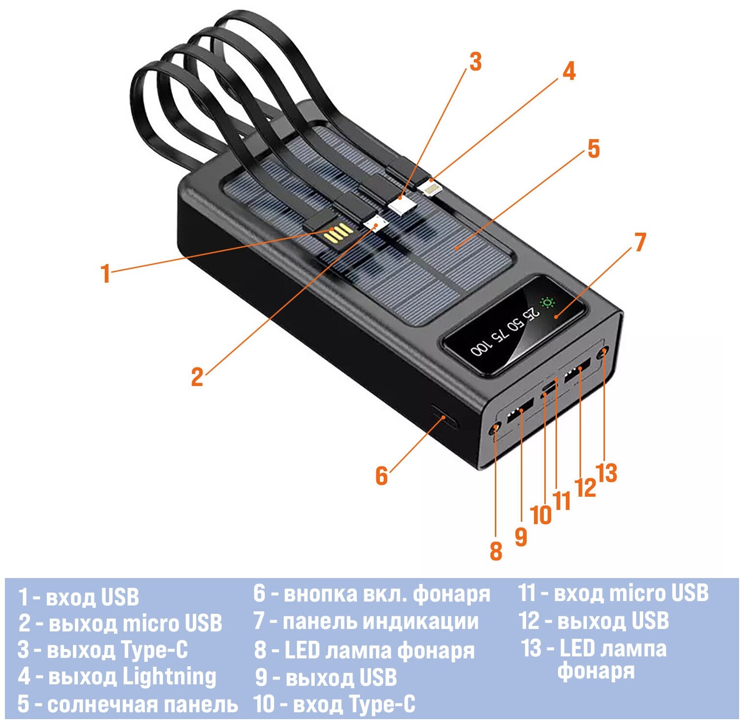 | Особенности | солнечная батарея / фонарик / индикатор заряда / Зарядка 4-х устройств |