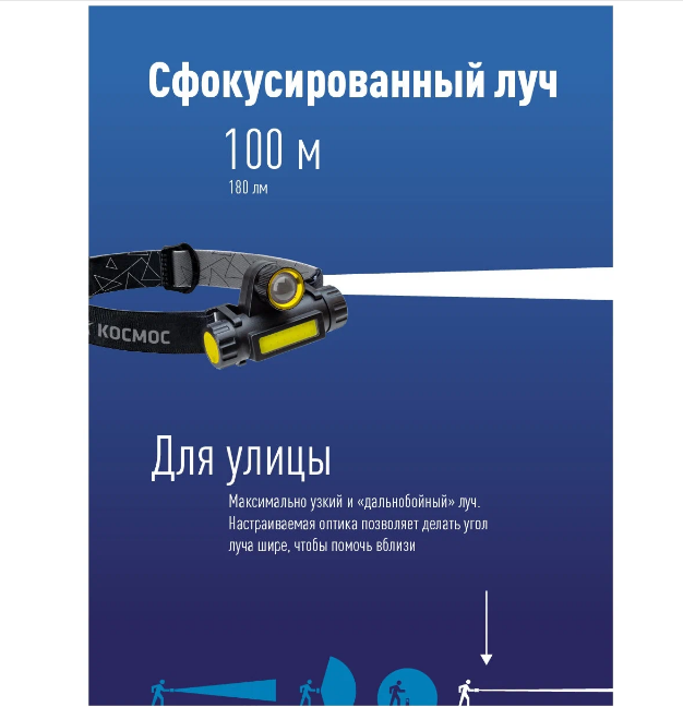 Фонарь налобный аккум. KocH103WLith , с зумом космос 3Вт ХРЕ, 3Вт СОВ, литий 1200mAh космос (1/24)