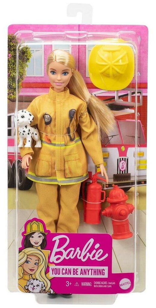 | Комплектация | 1 кукла Барби в костюме пожарного, 1 фигурка питомца, аксессуары |