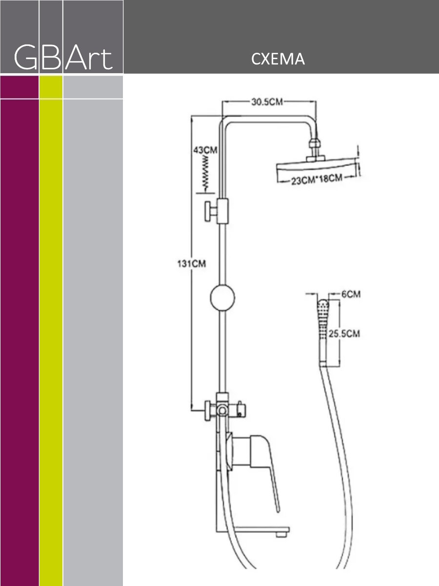 | Дополнительная информация | высота стойки для душа: 1310 мм; длина верхнего душа: 180 мм; ширина верхнего душа: 230 мм |