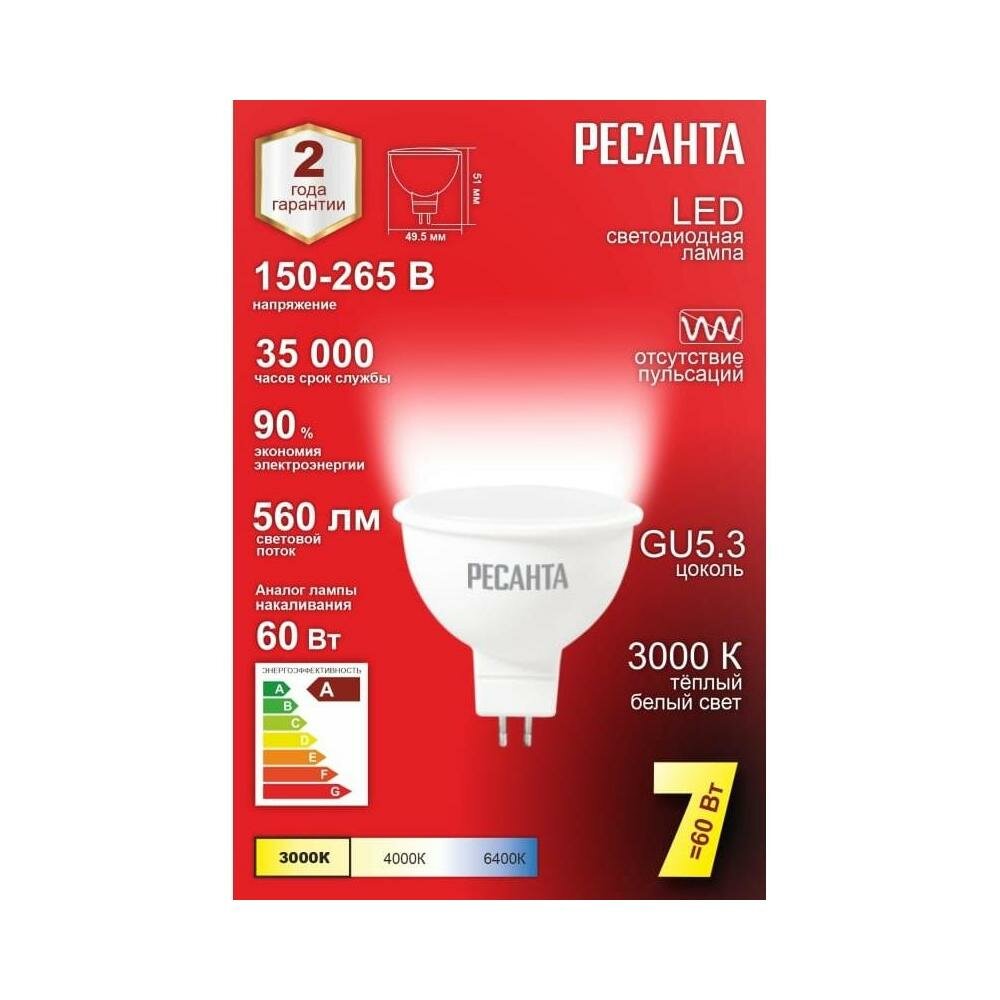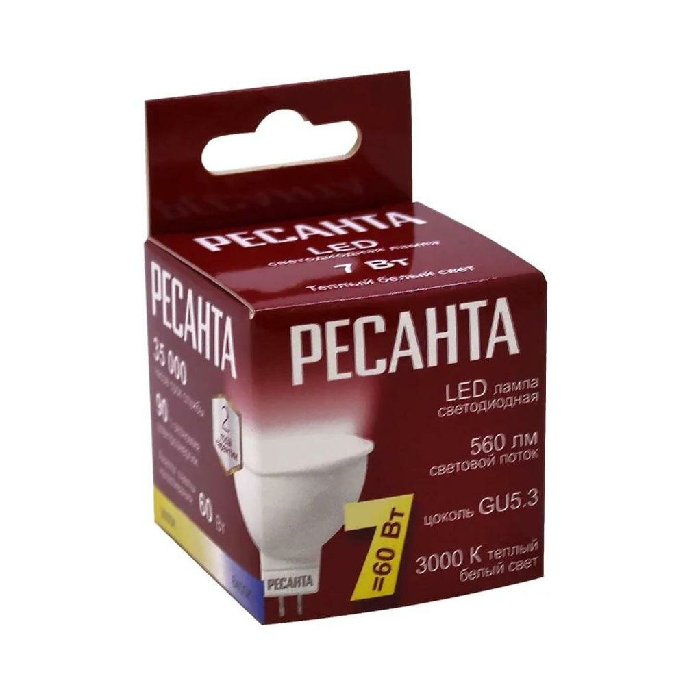 Лампа светодиодная Ресанта LL-R-MR16-7W-230-3K-GU5.3, 220 В, 7 Вт, 2700-3000К, 80 Ra, FR/матированная, MR16, 560 Лм, 35000ч