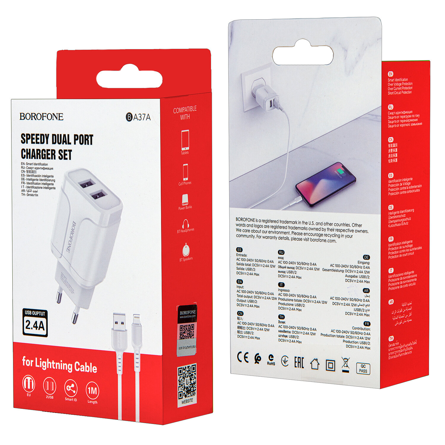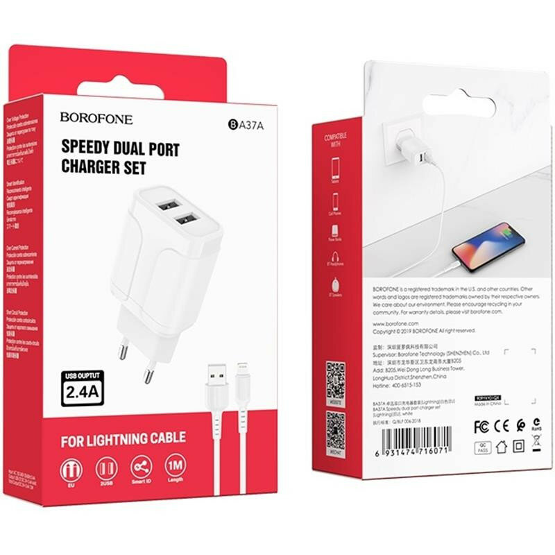 Сетевое зарядное устройство BOROFONE BA37A Speedy 2xUSB с Кабелем USB - Lightning, 2.4A, 10.8W, белый