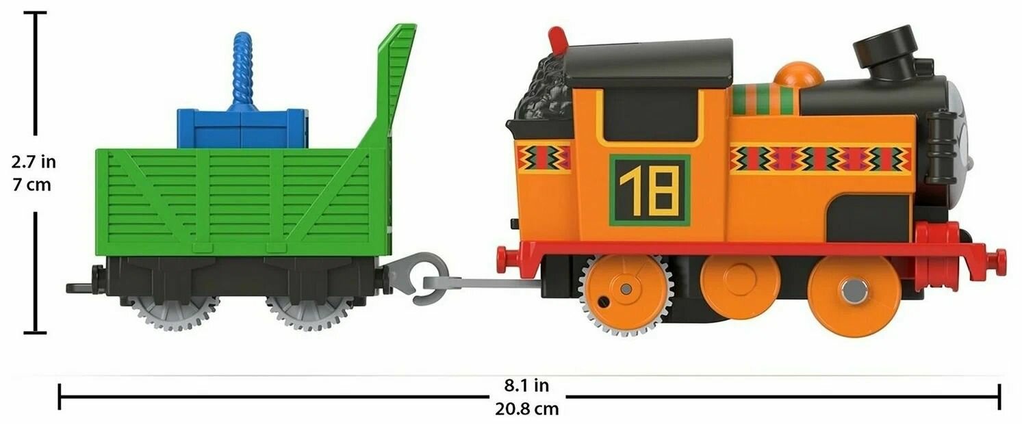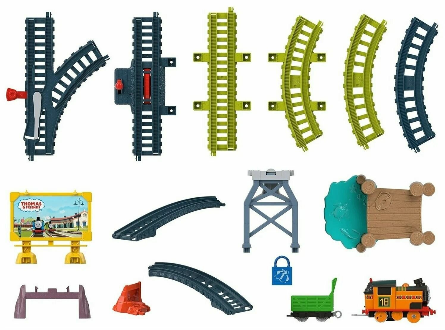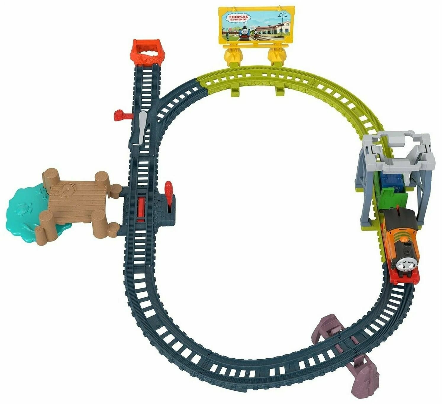 | Подробная комплектация | 1 паровозик, 1 вагончик, 1 ящик, 1 док, 1 рекламный щит, 8 деталей трассы, тематические аксессуары |