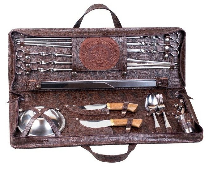 | Комплектация | 1. Сумка-кейс из искусственной кожи 1шт. 2. Стаканы из нержавеющей стали 6шт. 3. Штопор сомелье 1шт. 4. Вилки из нержавеющей стали 6шт. 5. Ложки из нержавеющей стали 6шт. 6. Нож охотничий из нержавеющей стали с рукоятью из ореха и латуни 1шт. 7. Нож-тяпка из нержавеющей стали с рукоятью из ореха и латуни 1шт 8. Тарелки из нержавеющей стали 6шт. 9. Шампура из нержавеющей стали 6шт 10. Мангал складной из нержавеющей стали 1шт 11. Чехол из спанбонда (нетканый мягкий материал) 1шт. |