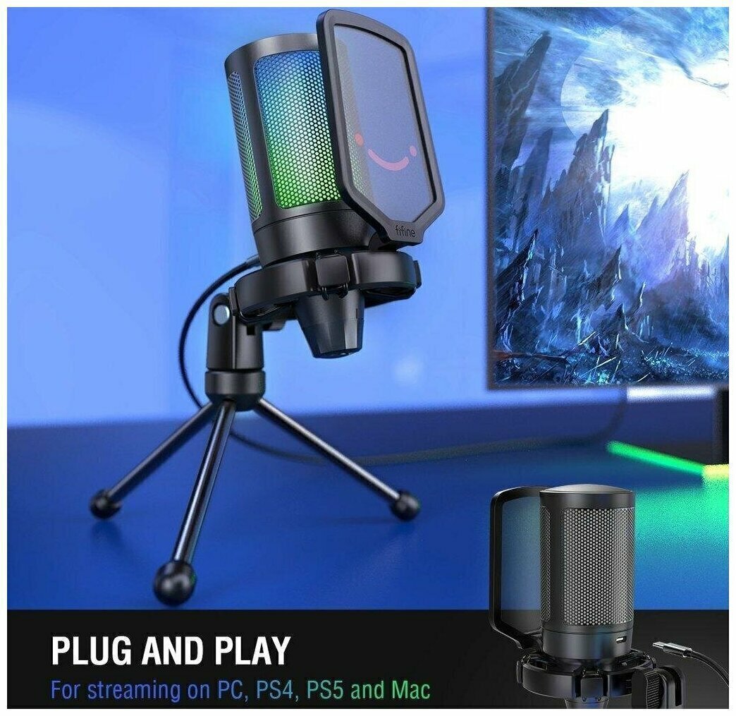 СохранитьКонденсаторный USB Микрофон Fifine A6V Ampligame с RGB-подсветкой (компьютерный, игровой, для стримов, для конференций, Black) интересное: