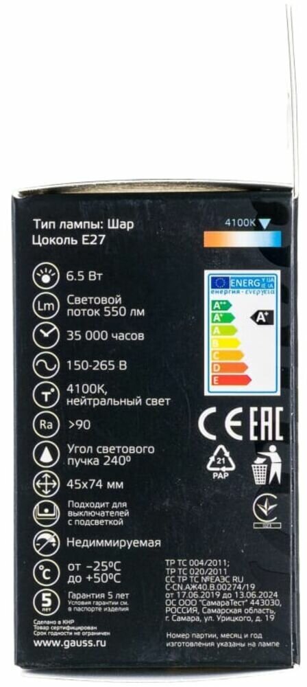 Купить Лампа светодиодная Black 6.5Вт шар 4100К нейтр. бел. E27 550лм GAUSS 105102207