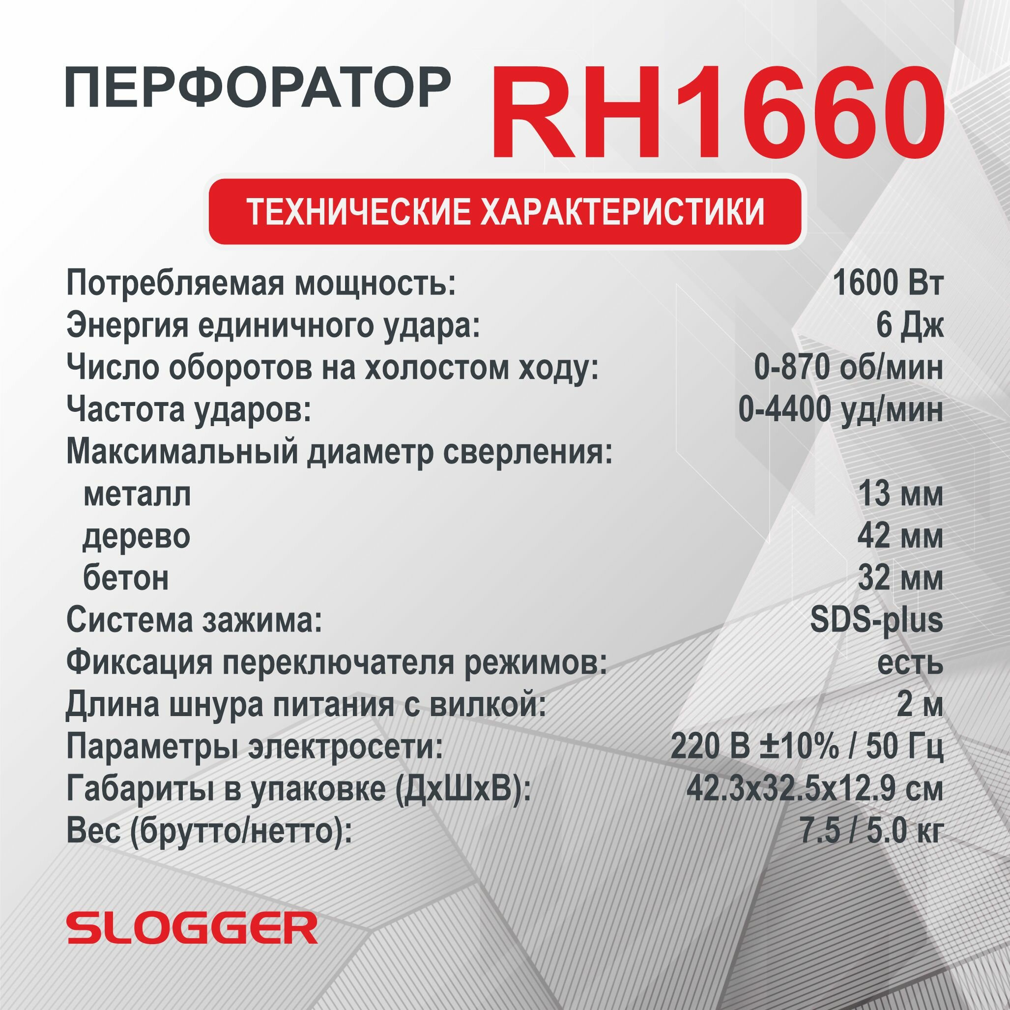 Перфоратор сетевой SDS-plus Slogger RH1660, 1600 Вт, 6 Дж