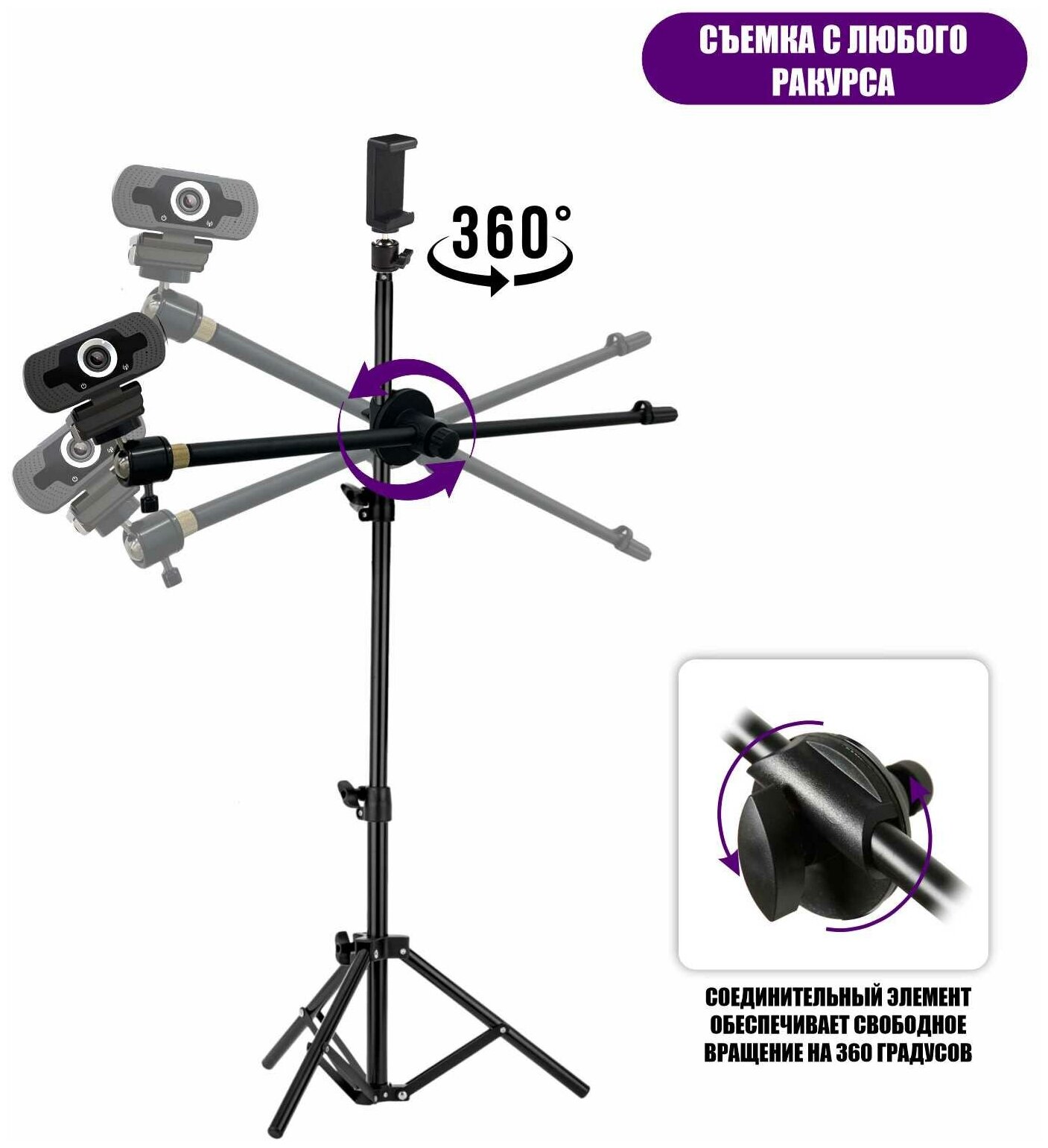 | Дополнительная информация | Особенности: - Лаконичный дизайн. - Высококачественный материал. - Возможность дополнительно установить кольцевую лампу на штатив для более качественной фото и видео съемки. - Поворот журавля на 360 градусов. - Возможность снимать фото и видео контент как в вертикальном, так и в горизонтальном положении. - Удобная площадка с возможностью крепления как на экране монитора, так и на стойке. - Компактность и мобильность. - Автоматическая регулировка яркости. - Ручная фокусировка. - Телескопический штатив с возможностью подобрать оптимальную высоту. - Устойчивая и надежная опора - Возможность установить шарнирное крепление как на штатив, так и на журавль, в зависимости от Ваших требований. |