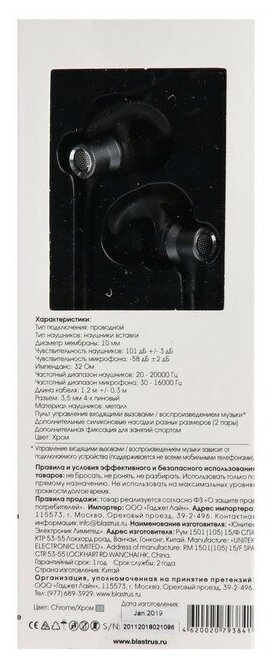Blast Наушники Blast BAH-295, микрофон, вакуумные, 101 дБ, 32 Ом, 3.5 мм, 1.2 м, хром