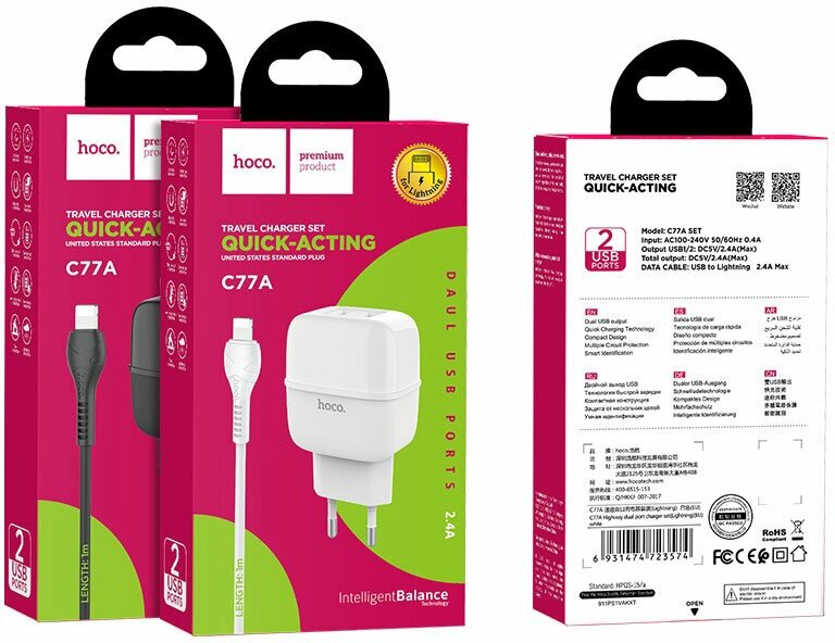 Сетевое ЗУ HOCO C77A, 2хUSB-А, 2.4A + кабель (AM-microBM), 1 м, белый (12/120)