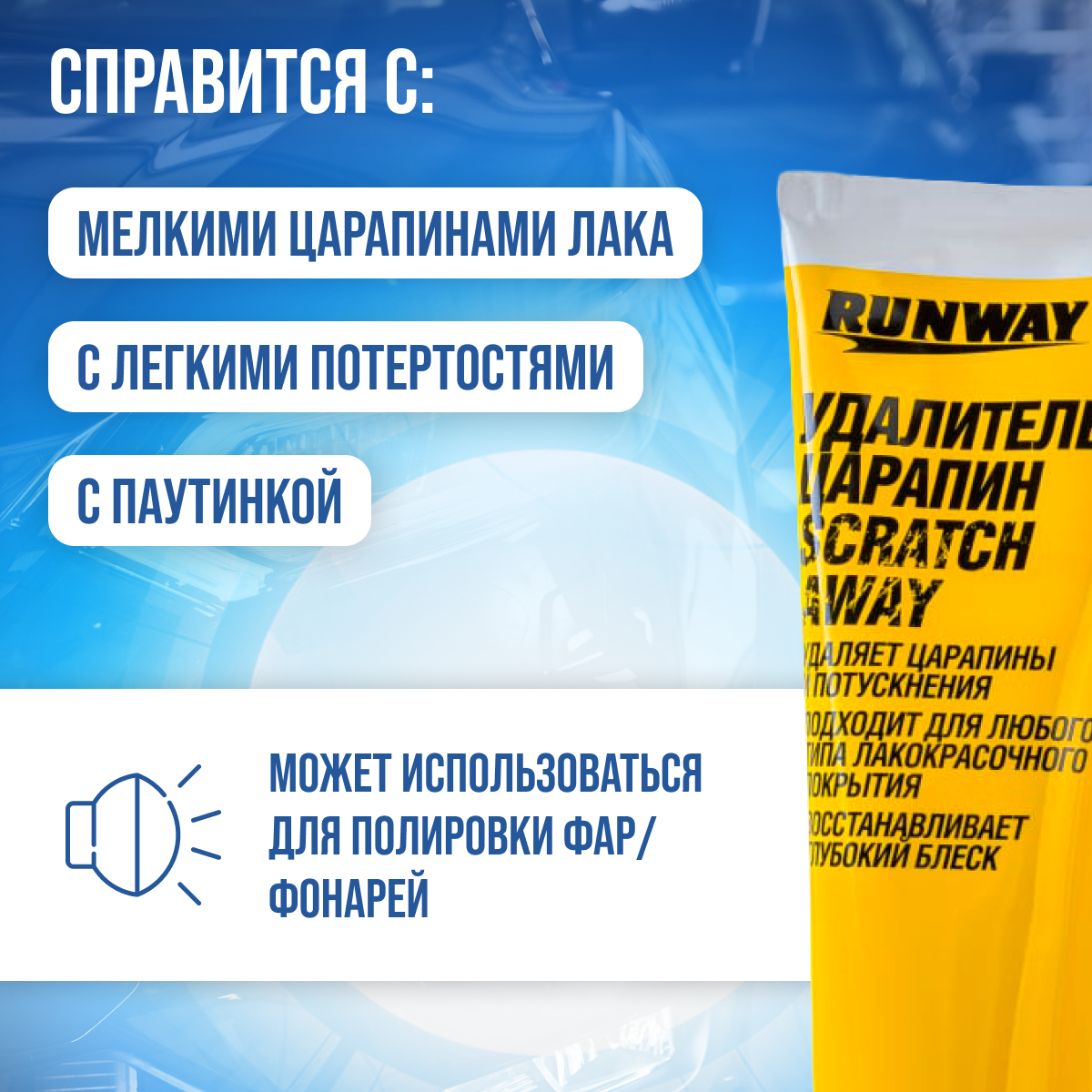 Полироль кузова Runway Scratch Away, абразивный, устраняет царапины, подходит для подготовки поверхности к нанесению жидкого стекла, туба 100мл, арт. RW0502