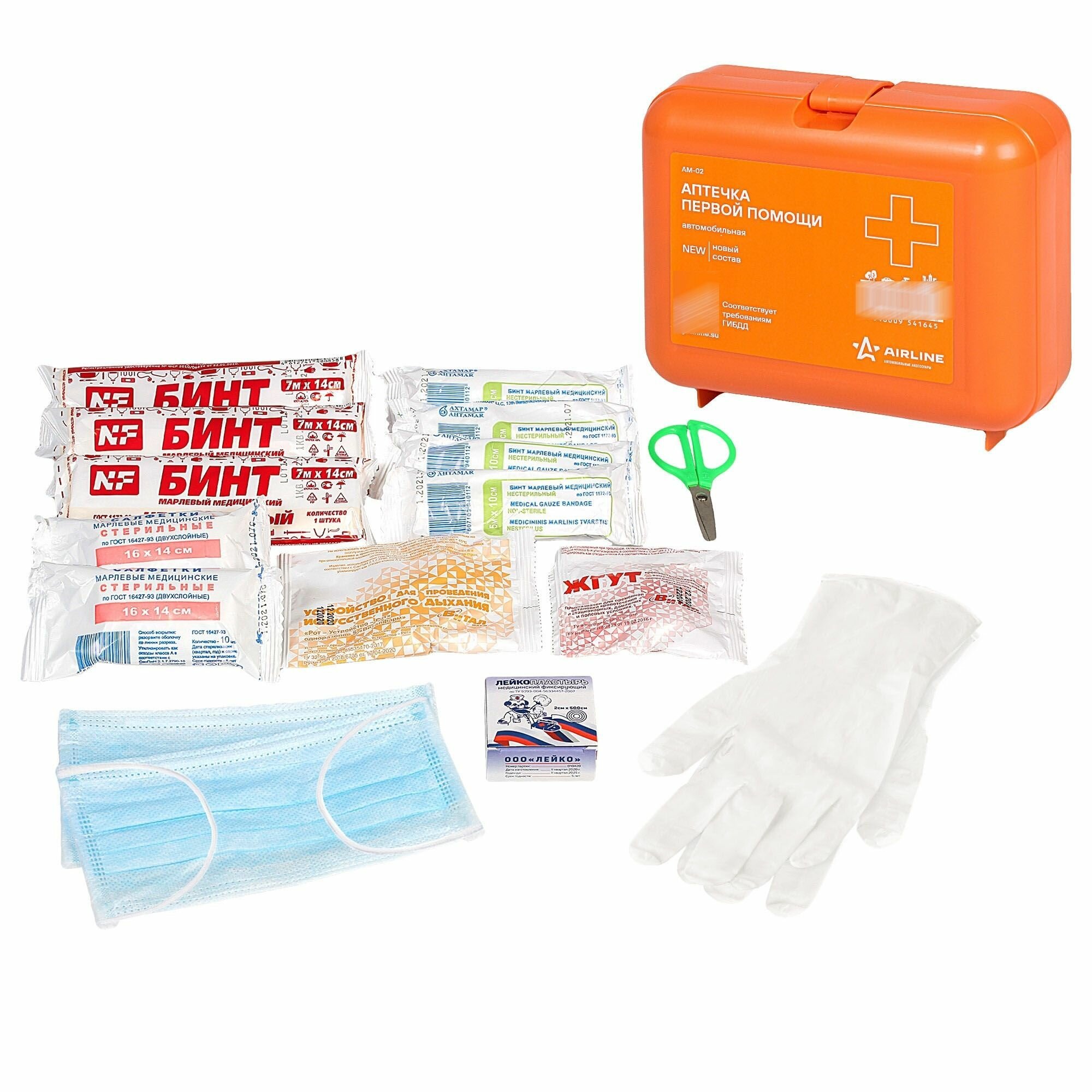 | Состав | Маска медицинская нестерильная одноразовая - 2 шт. Перчатки медицинские нестерильные, размер не менее М - 2 пары Устройство для проведения искусственного дыхания “рот-устройство-рот” - 1 шт. Жгут кровоостанавливающий текстильный - 1 шт. Бинт марлевый медицинский, не менее 5 м x 10 см - 4 шт. Бинт марлевый медицинский, не менее 7 м x 14 см - 3 шт. Салфетки марлевые медицинские стерильные, не менее 16 x 14 см N 10 - 2 уп. Лейкопластырь рулонный, не менее 2 х 500 см - 2 шт. Ножницы - 1 шт. Инструкция по оказанию первой помощи с применением аптечки для оказания первой помощи пострадавшим в дорожно-транспортных происшествиях (автомобильной) - 1 шт. Футляр - 1 шт. |