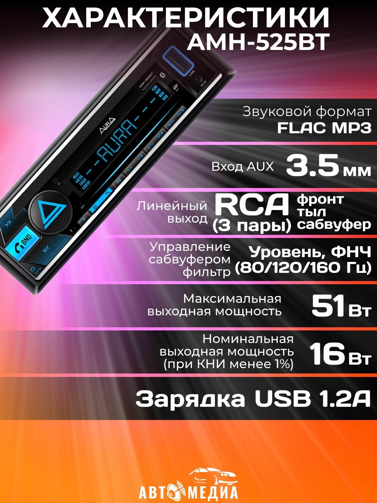 Автомагнитола Aura AMH-525BT /Подключение кнопок на руле/ Bluetooth / FLAC, MP3 / RGB-подсветка / 10-полосный эквалайзер / интересное:
