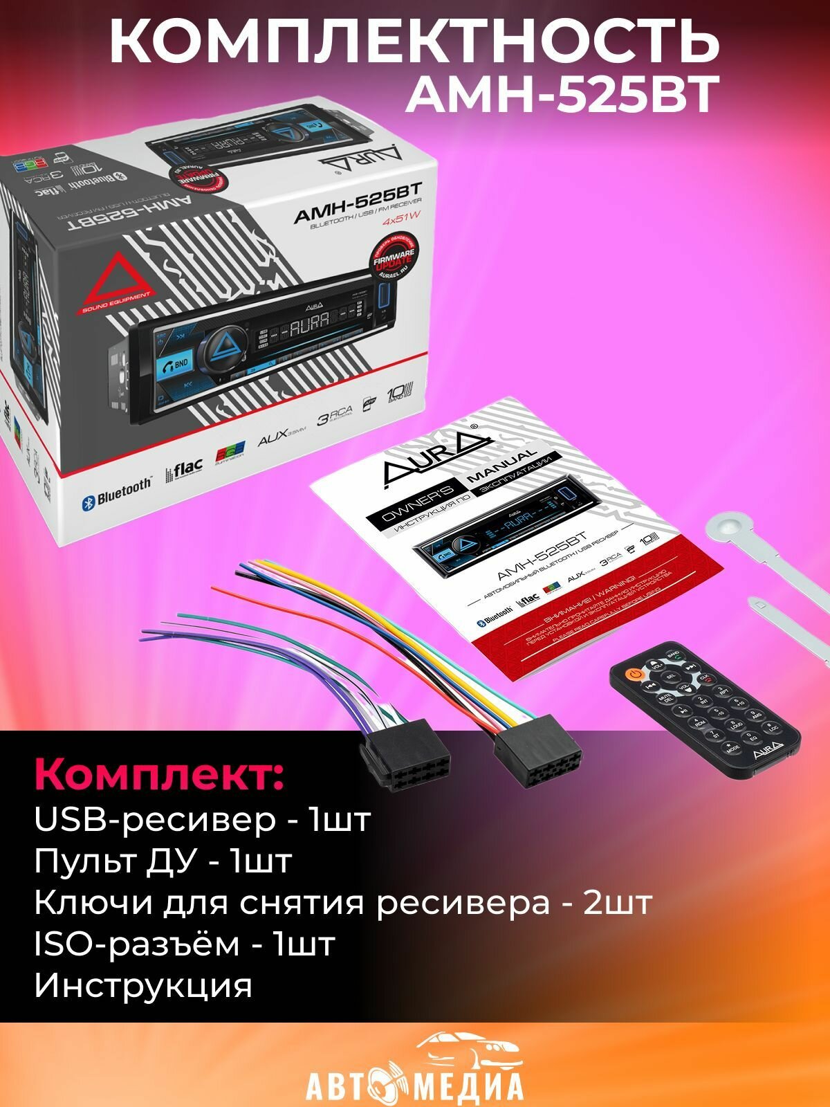 Магнитола, пульт ДУ, ISO коннекторы, документация