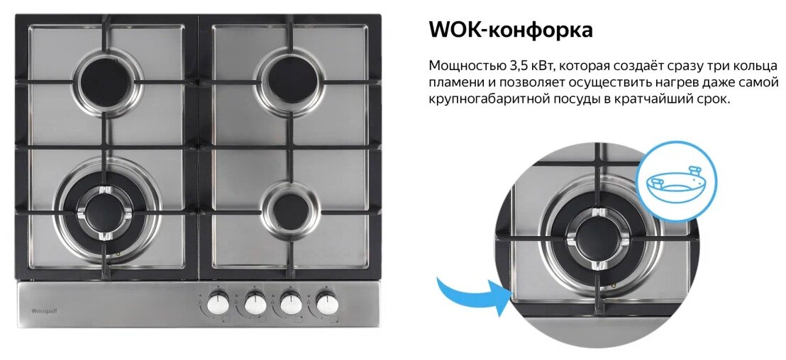 Газовая панель Weissgauff HGG 641 Xh WOK-конфорка, Рукоятки Hi-Tech, газ-контроль