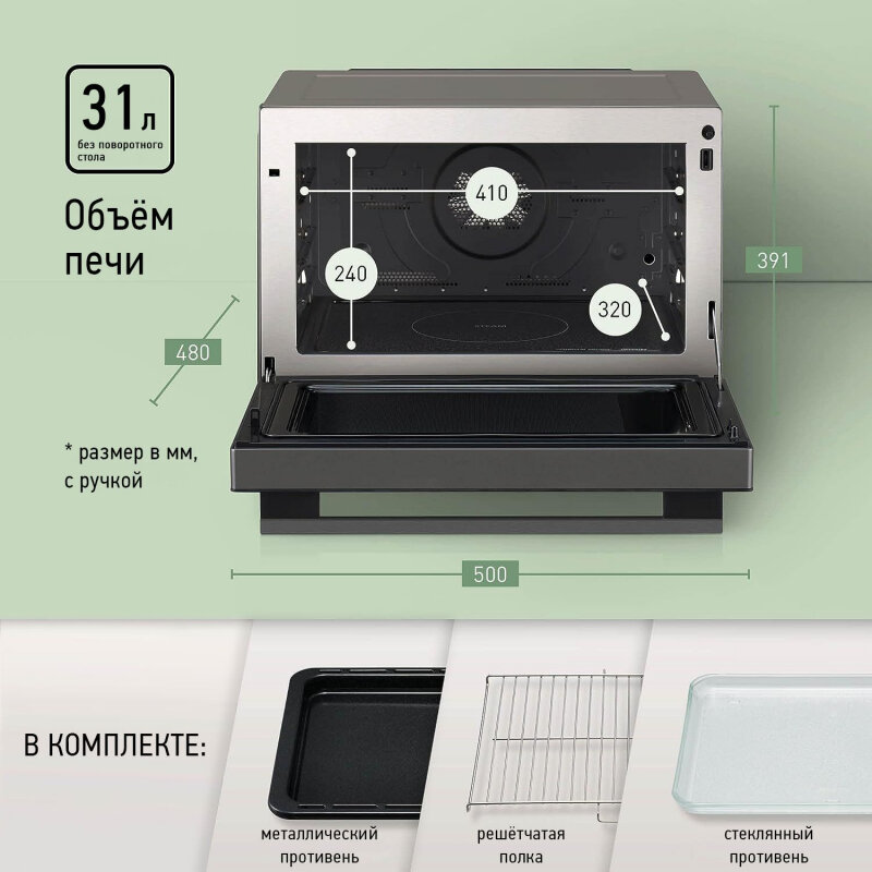 | Дополнительная информация | материал поворотного стола и смотрового окна - стекло; функция быстрого старта ; потребляемая мощность - 2080 Вт; мощность конвекции: 1350 Вт; количество рецептов автоподогрева: 12; количество режимов авторазморозки: 3 |