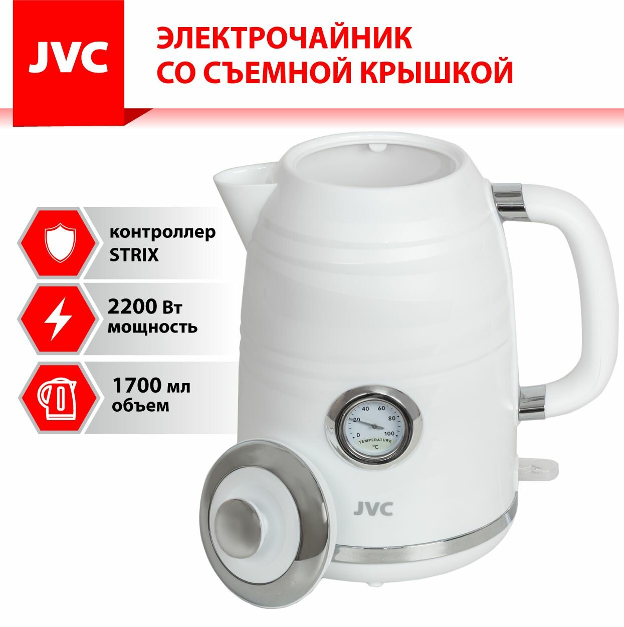 Чайник электрический JVC JK-KE1744 1,7 л с датчиком температуры, контроллер STRIX, съемная крышка, съемный фильтр от накипи, 2200 Вт