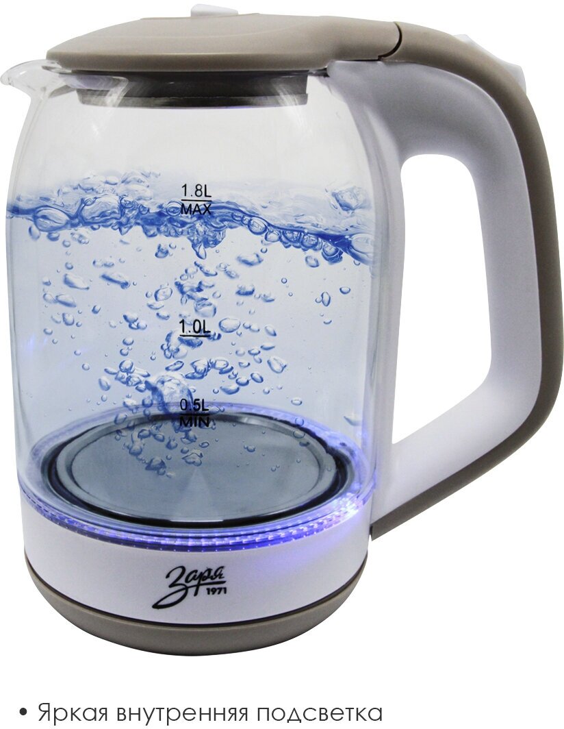 Электрический чайник Заря 258-01 1.8 л / стеклянный / с подсветкой / дисковый ТЭН / автоотключение / поворот на 360 / электрочайник / 1500 Вт / белый