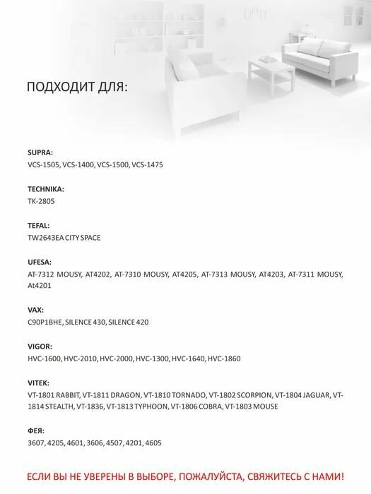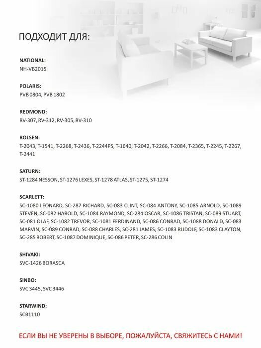 | Совместимые модели | Atlanta, Beko, Bimatek, Bork, Cameron, Clatronic, Elekta, Elenberg, Evgo, Hitachi, Polar, Polaris, Rolsen, Sanyo, Scarlett, Severin, Shivaki, Trony, Vitek, Фея |