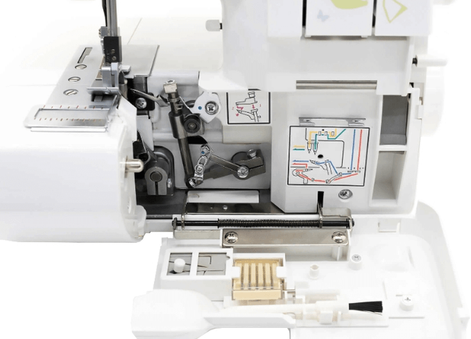 | Плюсы: | Легко настраивается, не требователен к ниткам, удобно заправлять петлители т.к. крышка открывается в сторону, запасные ножи в комплекте, подходит для новичков (достаточно прост в работе и обслуживании). |
