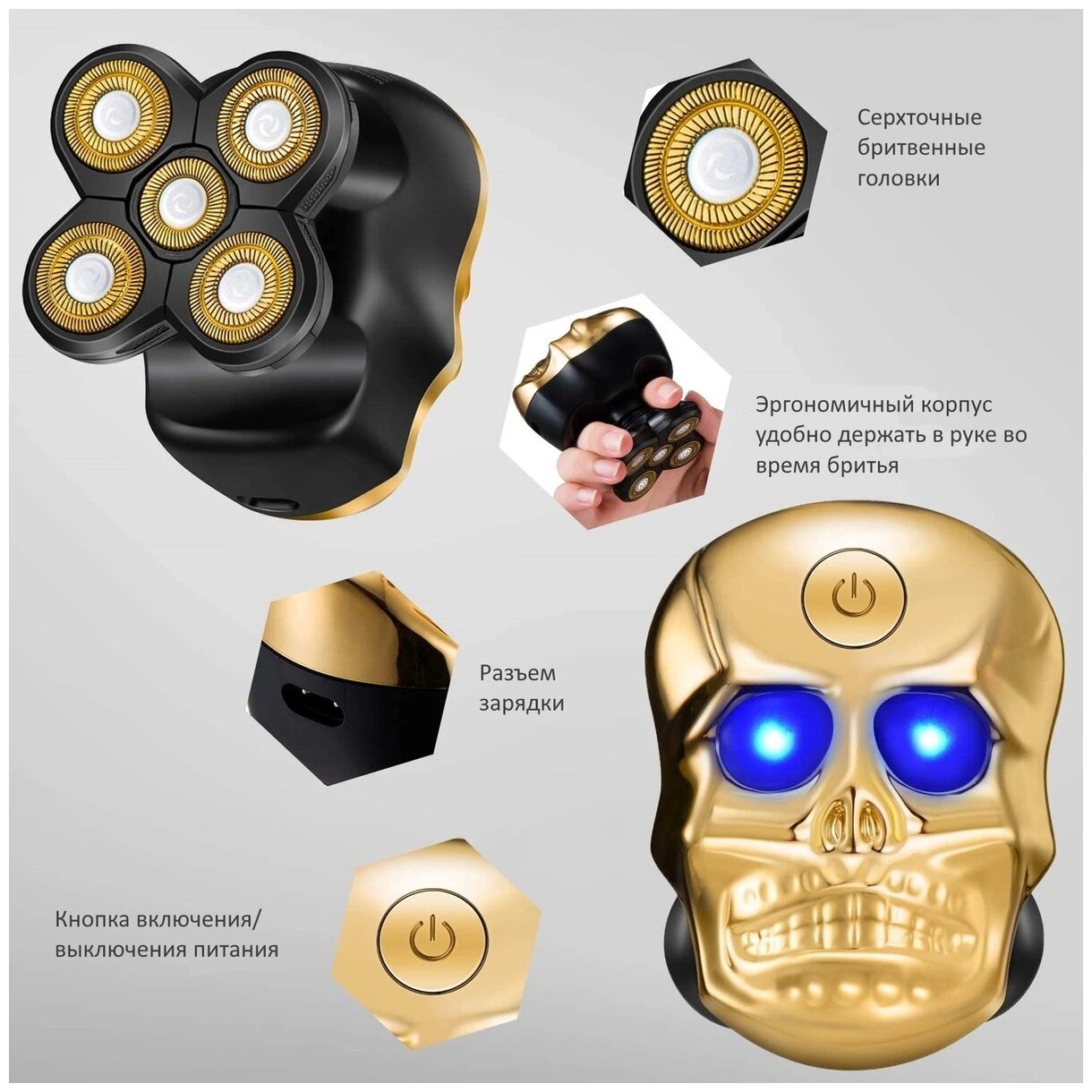 Машинка для бритья головы ZDK LK9800 "Череп" 6 насадок, золотой интересное: