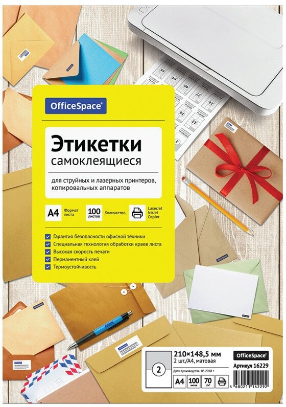 Этикетки самоклеящиеся OfficeSpace А4, 100 листов, белые, по 2 шт на листе (210х148,5 мм), 70 г/м2 (16229)