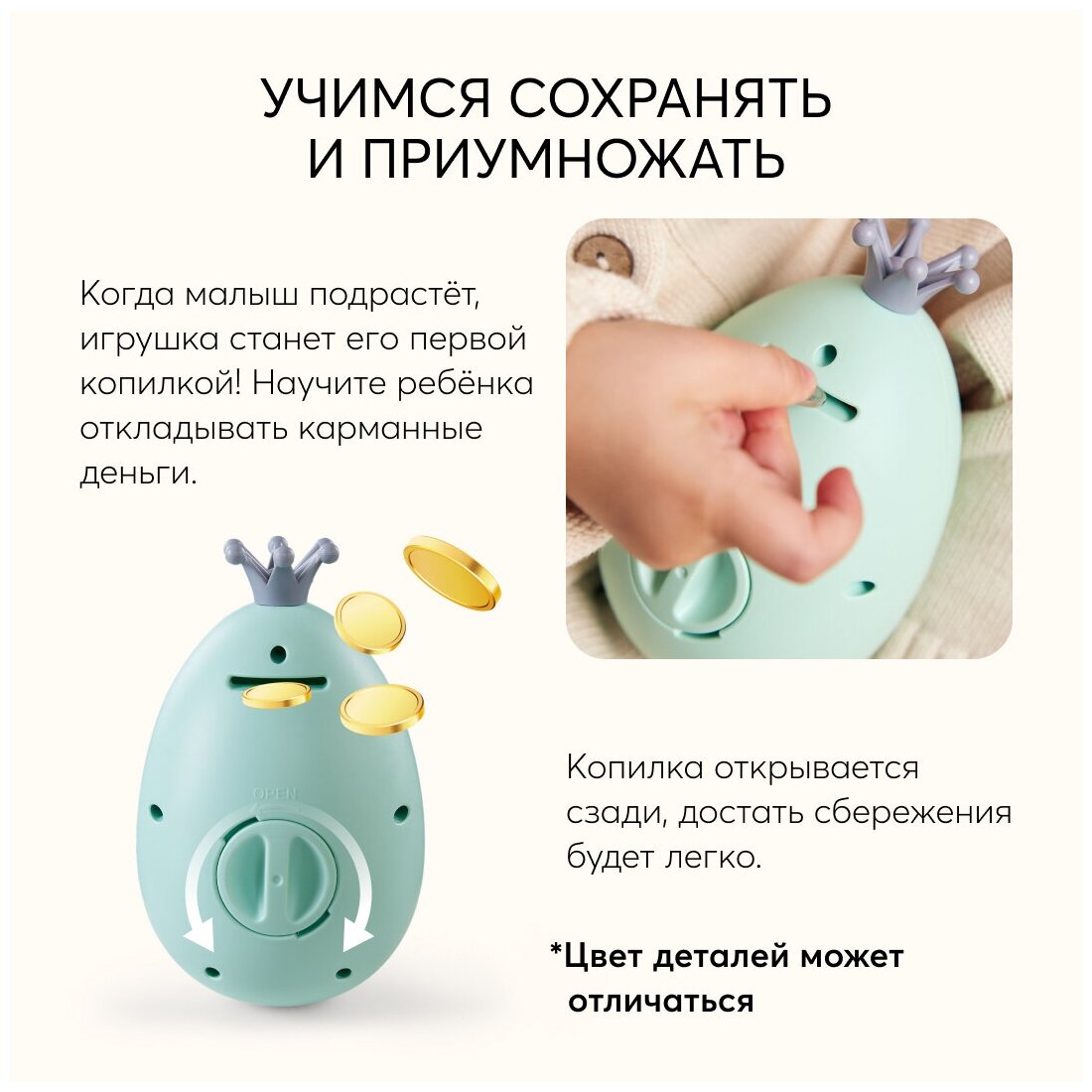 В игрушке есть несколько функций: погремушка, сортер и копилка. по сути можно подарить маленькому ребёнку, и игрушка будет востребована в разном возрасте. Сделана качественно