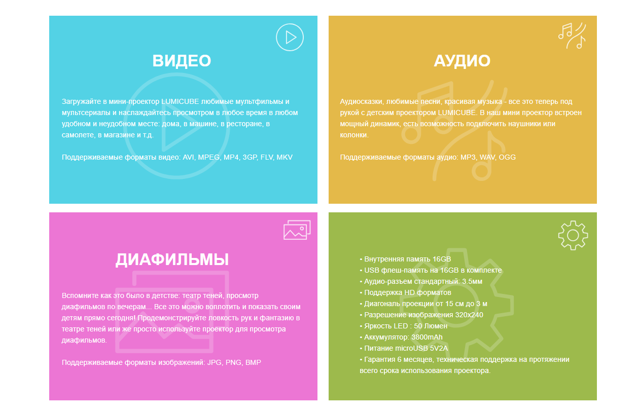 Ниже Вы можете прочитать отзывы на Проектор Lumicube MK1 (Голубой), ознакомится с подробными характеристиками, посмотреть интересные обзоры и фотографии на Проектор Lumicube MK1 (Голубой).