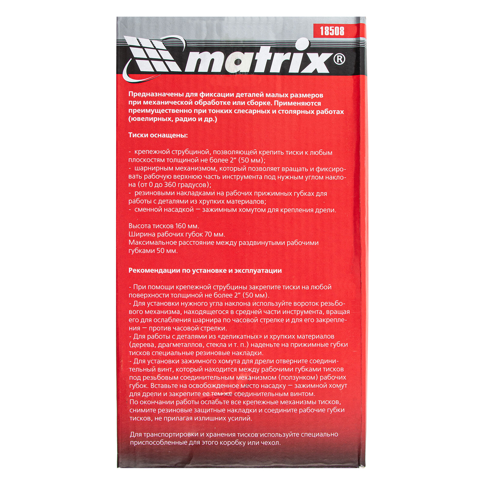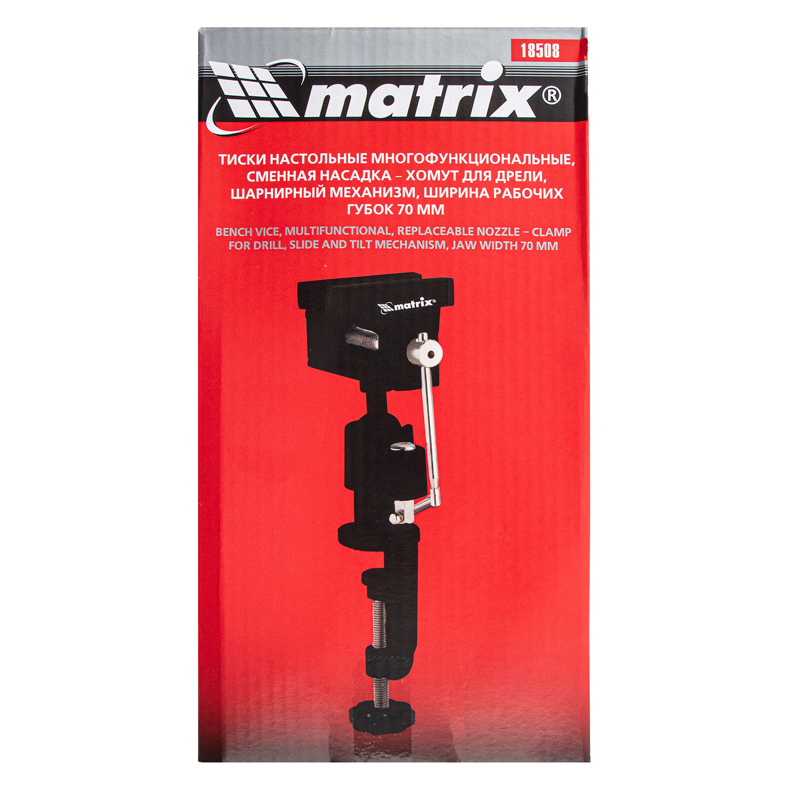 Тиски настольные Matrix 18508, 70 мм, многофункциональные, сменная насадка-хомут для дрели, шарнирный механизм