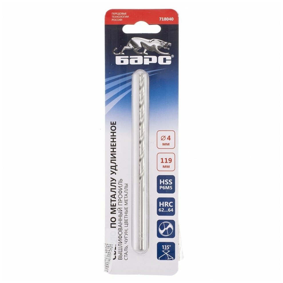 Сверло по металлу барс 718040, 4 x 119 мм, Р6М5, удлиненное