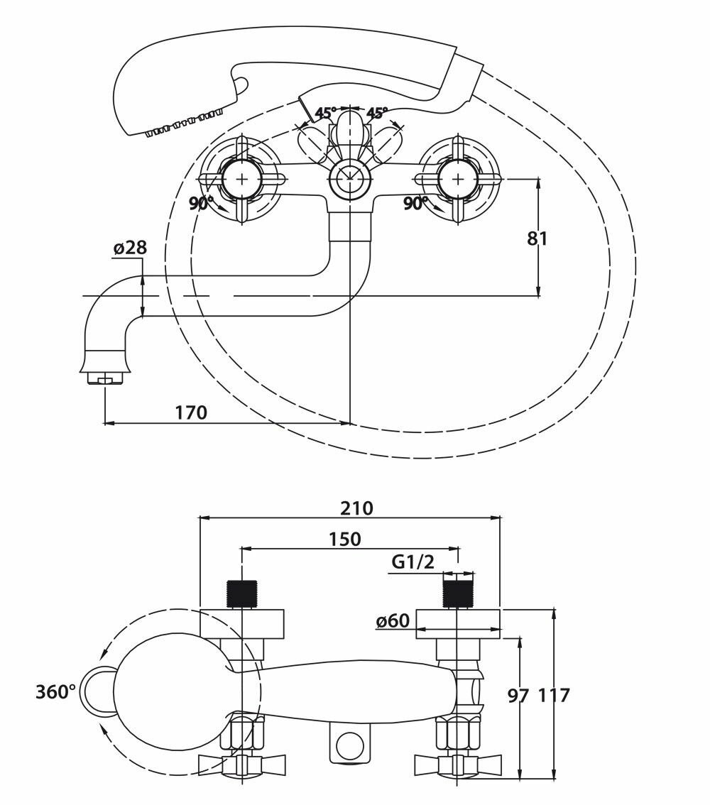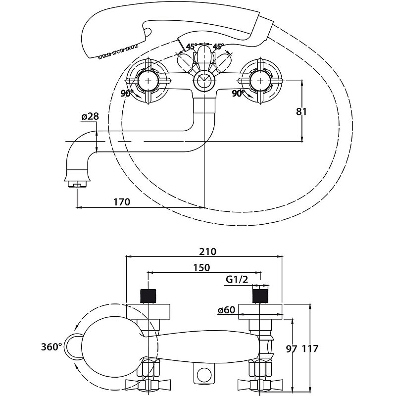 Смеситель для ванны и душа Kaiser (Кайзер) Cross 41022-1 Bronze двухвентильный с лейкой и шлангом, цвет - бронза
