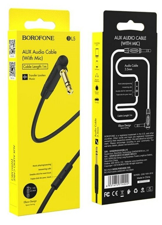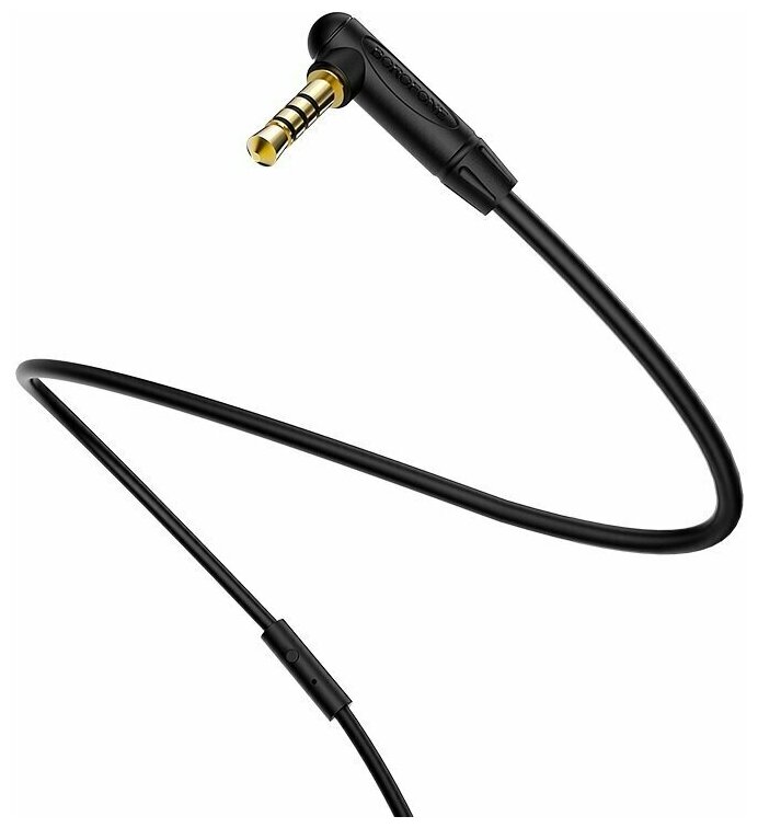 Аудио-кабель BOROFONE BL5, AUX, Jack 3,5 - Jack 3,5, 1 м, черный, контроллер с микрофоном. Г-образный