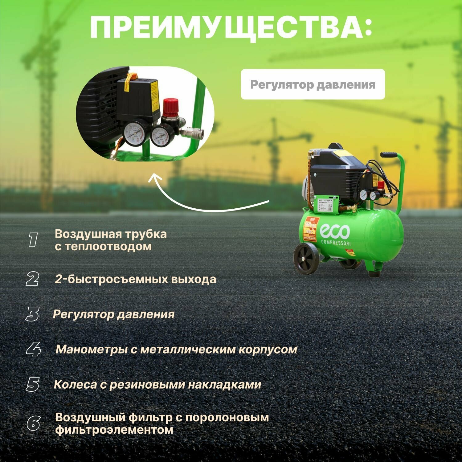 Компрессор воздушный масляный ECO AE-251-4 (260 л/мин, 8 атм, коаксиальный, ресив. 24 л, 220 В, 1.80 кВт) (AE-251-4)