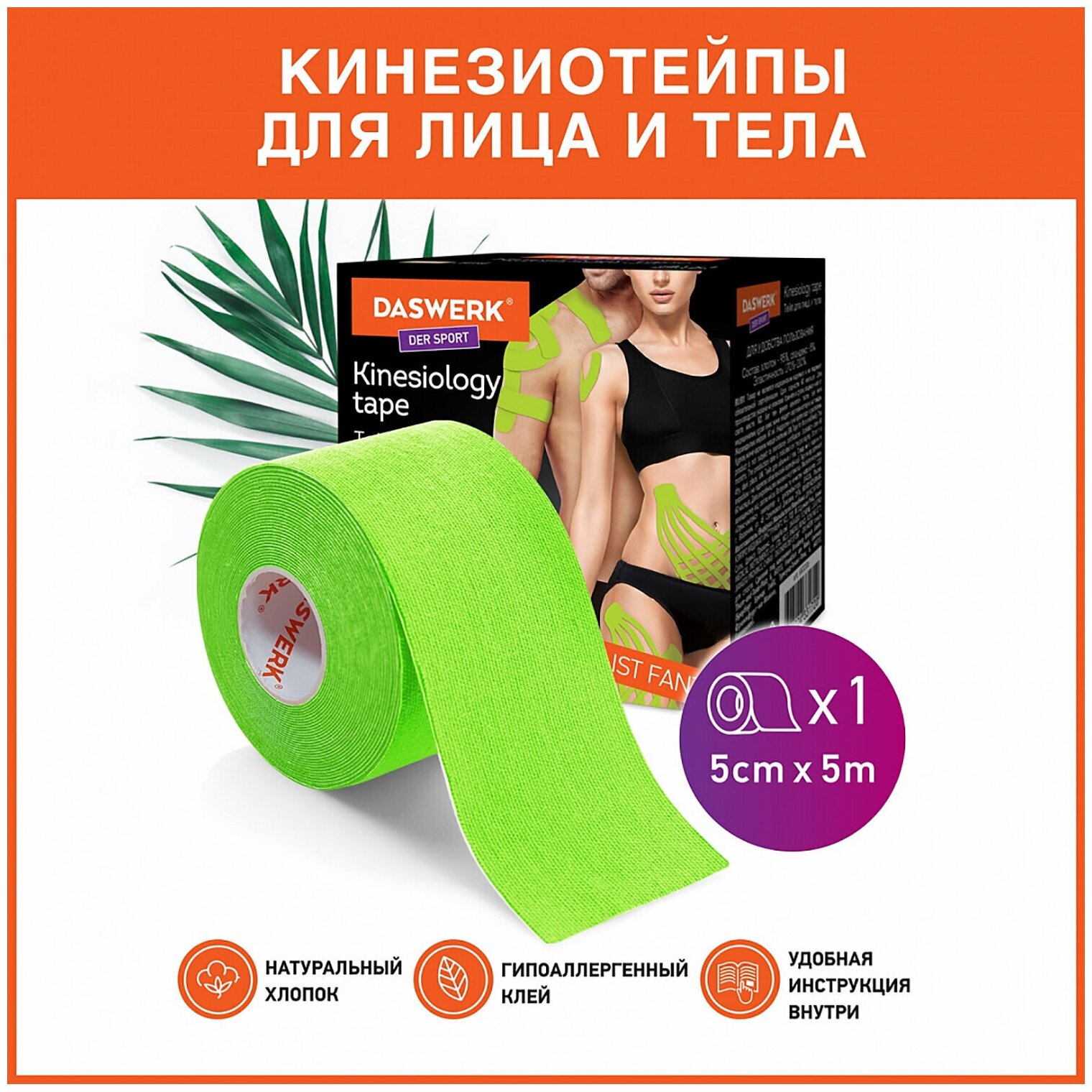 Кинезио тейп/лента для лица и тела, омоложение и восстановление, 5 см х 5 м, зеленый, DASWERK, 680006