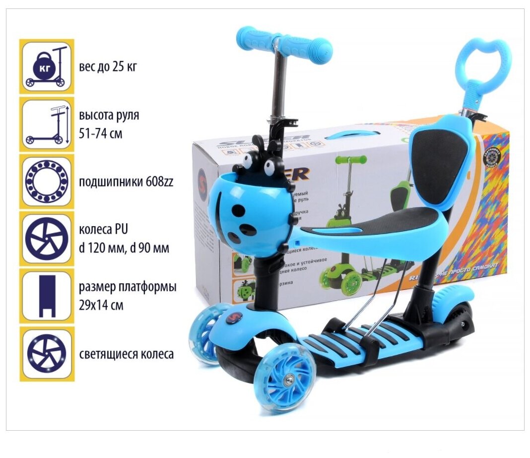Самокат-каталка Slider 3-х колесный, 5 в 1 синий колеса свет, до 25кг