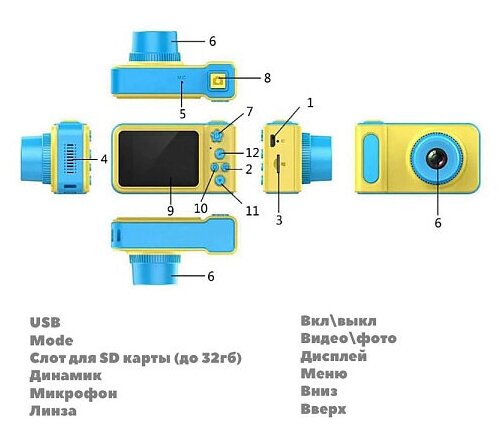 | Комплектация | Детская фотоаппарат Kids Camera, ремешок для носки, провод для зарядки и переноса фотографий, инструкция. |