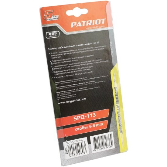 Patriot 350007504 Spq-113, пластиковый корпус, скобы тип 53 (4-8мм), 100 скоб в комплекте .