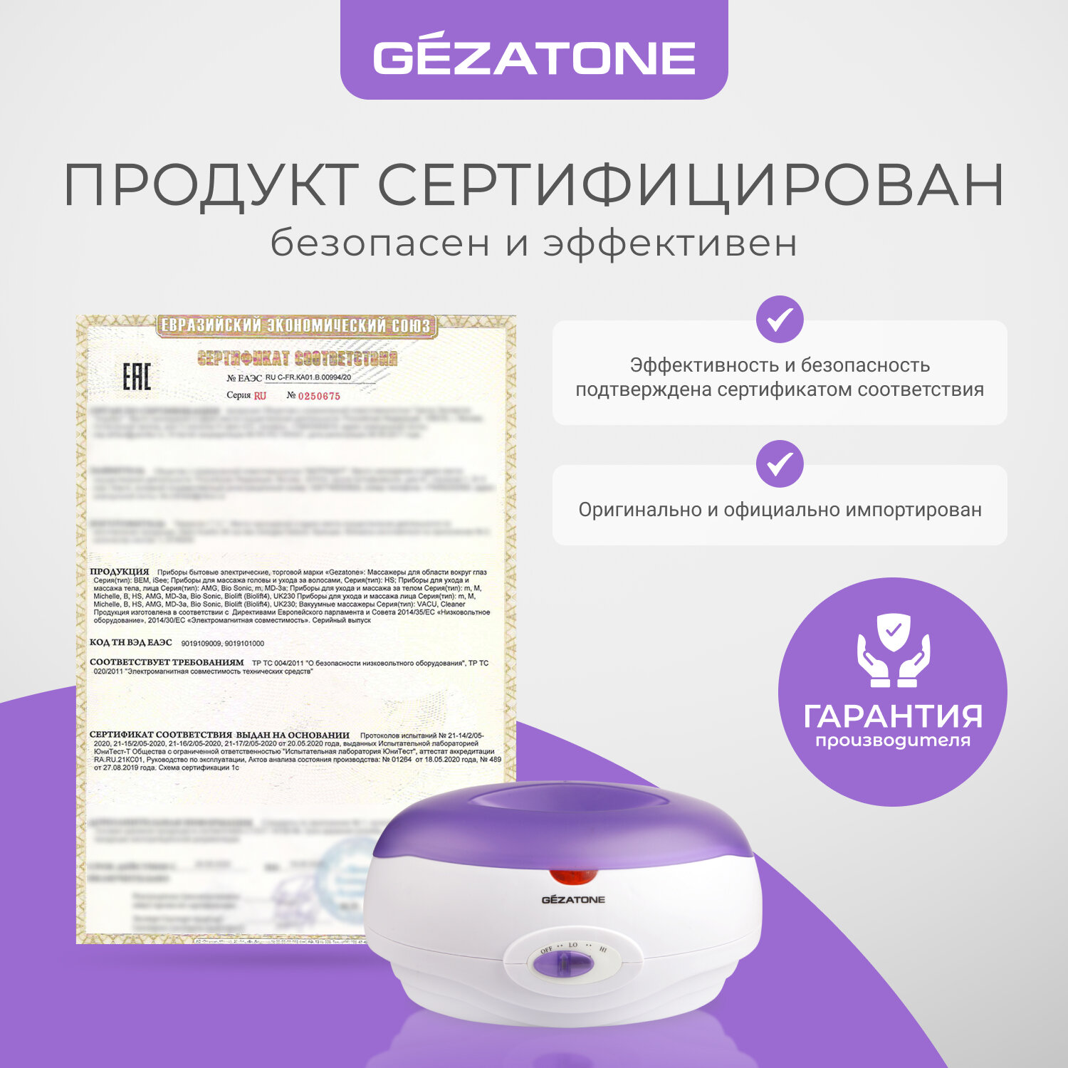 Парафиновая ванночка Gezatone WW3550, 250 Вт, фиолетовая